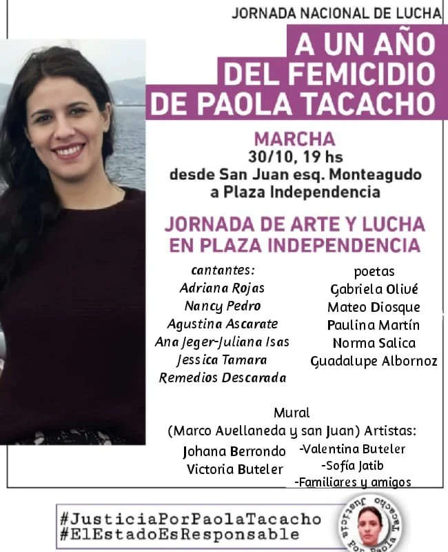 - El 30 de octubre a las 19 h, concentramos en calle San juan esquina Monteagudo y marcharemos hacia plaza Independencia. Donde se realizará un acto para rendirle homenaje a nuestra amada Paola.