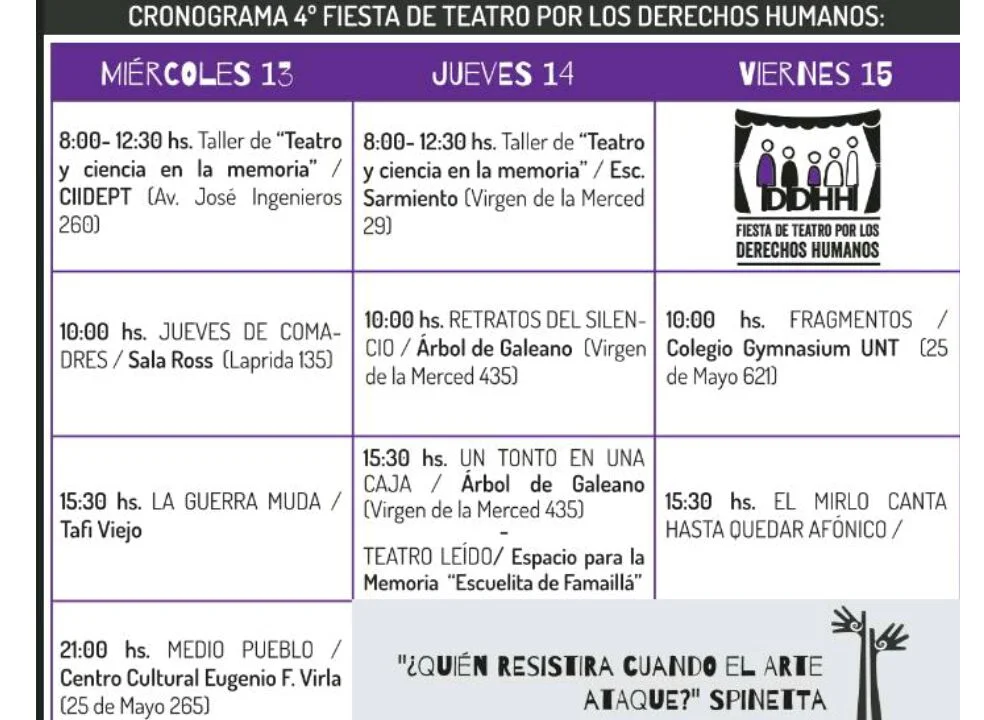 Ocho obras, tres días y tres ciudades. La cuarta edición de la Fiesta de Teatro por los Derechos Humanos arranca hoy, 13 de septiembre, con una seguidilla de puestas que pretenden convertirse en un espacio de encuentro y aprendizaje para diferentes grupos sociales. El festival se extenderá hasta el viernes (incluido) y tendrá lugar en la capital tucumana, Tafí Viejo y Famaillá.