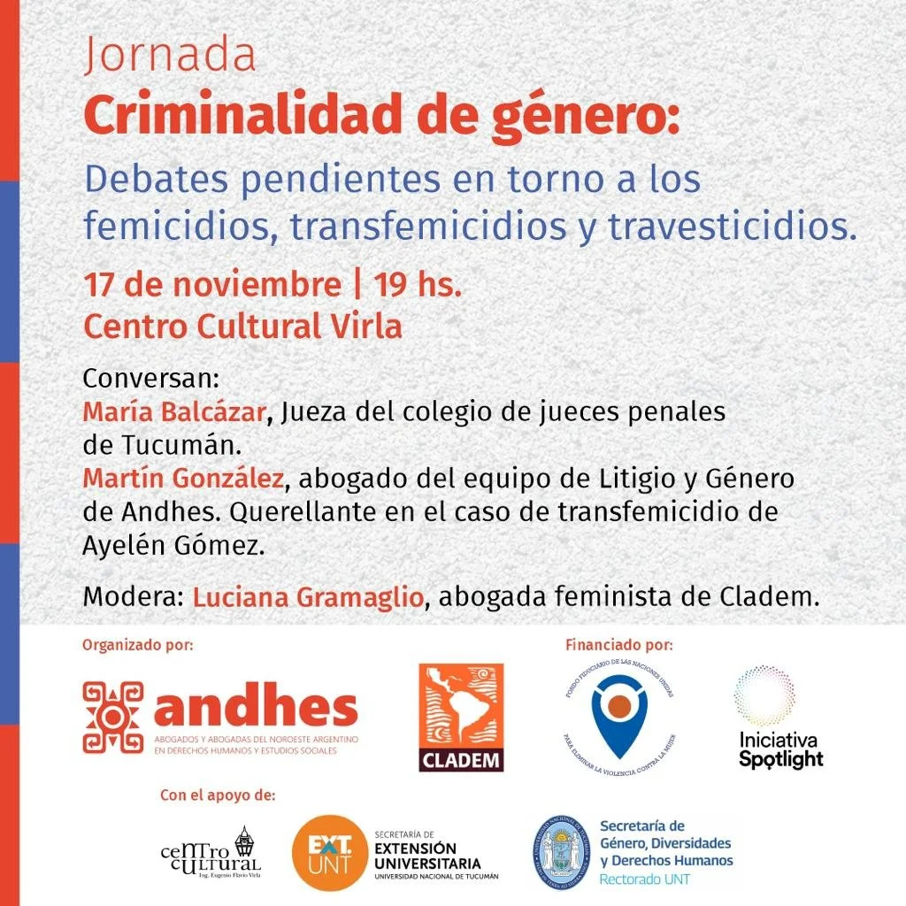 La actividad se llevará a cabo el día jueves 17 a las 19 hs en el Centro Cultural Virla (25 de Mayo 265) y particiaran María Balcazar, jueza del Colegio de Jueces Penales de la Provincia de Tucumán, Martín Gonzalez, abogado del equipo de litigio y de géneros de Andhes y querellante en el caso de transfemicidio de Ayelén Gómez y Luciana Gramaglio, abogada feminista de Cladem.