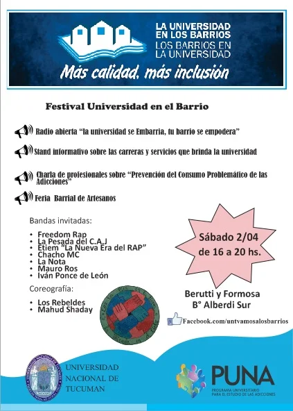 /El sábado 2 de abril se realizará el festival Universidad en el barrio. Las actividades incluirán un stand informativo, una radio abierta y la presencia de bandas y artesanos.