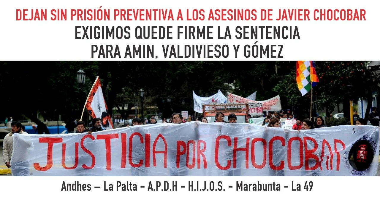 El 24 de octubre de 2018 culminó el juicio con la sentencia en el caso Chocobar. Se condenó a Dario Amin a 22 años de prisión, y a los ex policías Luis “el niño” Gómez a 18 años y José Valdivieso a 10 años. Los tres se fueron detenidos del tribunal por el ataque con armas de fuego y posterior asesinato de Chocobar y heridas contra otros comuneros. Tras 9 años de espera y reclamos a través de la lucha logramos la condena a los asesinos, pero el 7 de julio de 2020 el tribunal con las firmas de Maria Fernanda Bähler, Wendy Adela Kassar y Emilio Páez De La Torre concedió el cese de la prisión preventiva con el pago de $1.000.000 de caución y dejó en libertad condicional a los tres acusados, tras vencerse el plazo previsto para que la corte suprema de Tucumán deje firme la sentencia. Como cuando a meses del asesinato otro “descuido” de formas hizo que no cumplan siquiera prisión preventiva aunque era una amenaza evidente a la comunidad Indígena de Chuschagasta. Como los “descuidos” y los “tiempos de la justicia” demoraron 9 años el inicio del juicio oral. Como organizaciones que conformamos hasta el juicio oral la Mesa Justicia Por Chocobar exigimos quede firme la sentencia contra Amin, Valdivieso y Gómez y cumplan la condena como corresponde.