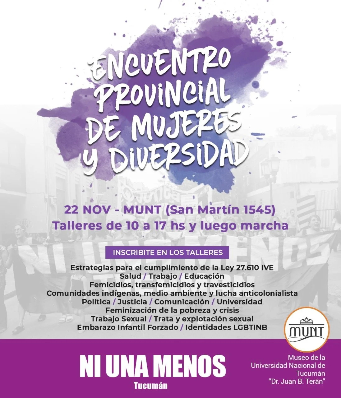 /Desde Ni Una Menos Tucumán hemos acordado convocar a un Encuentro Provincial de Mujeres y Diversidad con el propósito de generar un espacio de debate y organización en torno a nuestras luchas y reclamos. Desde hace 2 años que no se realizan los Encuentros Nacionales de Mujeres, ámbito que nos permitía año a año intercambiar nuestras posiciones, inquietudes y encontrar formas de coordinar y potenciar nuestra lucha.